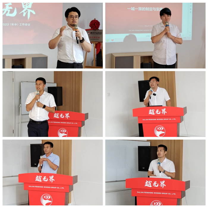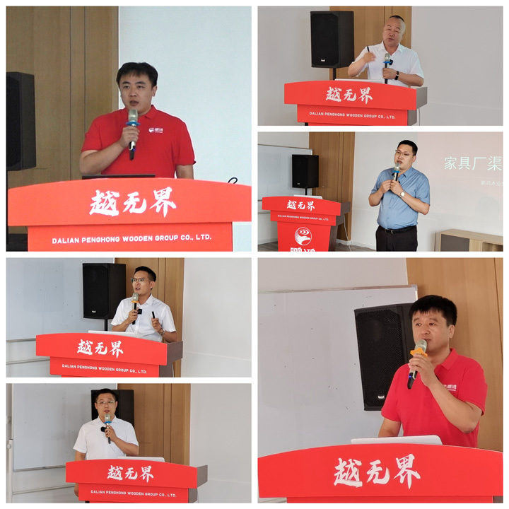 本次工作会现场,鹏鸿木业集团四大销售事业部、大区相关负责人走上台前,复盘半年度工作,分享工作经验,探讨营销策略。