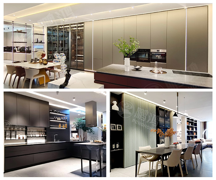 与传统工业化加工不同,鹏鸿家居展厅倾注了更多的人文关爱。45°拼接工艺、海棠角收边护角、门墙柜一体化输出、PET造型门板、内嵌式隐藏卡件……家居不再是冰冷的组装件,而是从视觉、听觉、触觉等多重角度,全方位呵护生活的“家庭成员”。